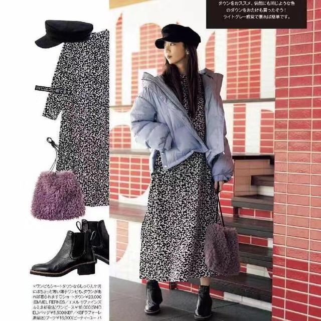 同样是蓝色的短款外套,清新减龄又甜美。灰色碎花长裙,碎花裙给人的感觉就是十分的清新,又是满满的淑女感,灰色的设计又是多了几分复古成熟感。搭配一个紫色毛绒手提包,低调奢华,再穿一双黑色短靴,保暖又百搭。这种混搭风格,穿出复古清新风。