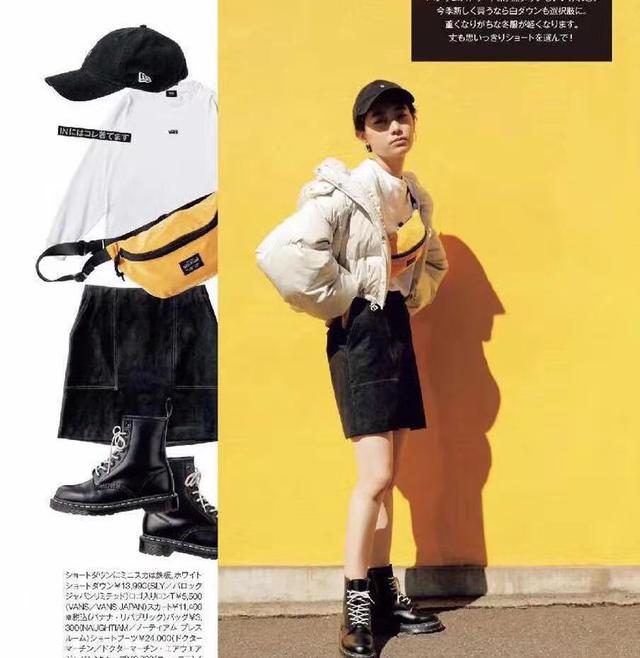 白色与黑色真的是十分经典款的搭配,不管是怎么搭永远也不会出错,十分的耐看又干净。白色的长袖T恤,胸上小刺绣的设计看起来不会显得太单调,搭配一条短款A字版型的牛仔短裙,简单的黑白搭配干净整洁,裙子两侧大口袋的设计,非常的时尚,搭配一双黑色马丁靴,很好的拉长了腿部线条,多了几分酷感。短款的白色面包服,很好的拉高腰线十分的显高,一个黄色胸包的搭配,多了一丝色彩,青春又活力,让上半身的棉服看起来不是特别的厚重。