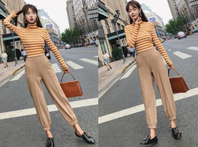 搭配1、打底衫春季还是比较百搭的一款上衣,条纹的设计让你的身形看起来很舒适,而且小高领的设计在这个春天还可以给你足够的温暖感,版型是刚刚好的设计,搭配休闲裤,裤子是灯笼裤的设计,让矮个子女生也可以穿出显高的气息,这样穿最好看了。
