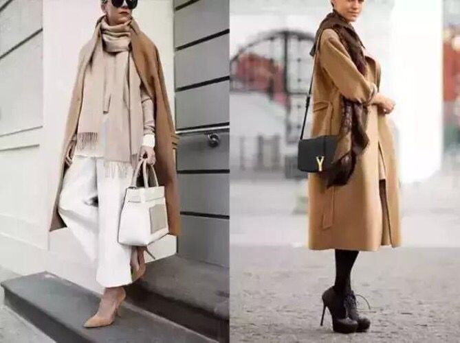 如果你足够有腔调,选择和驼色大衣同色的围巾,围巾的颜色选择较深一号色,或者较浅一号色或更有层次感。