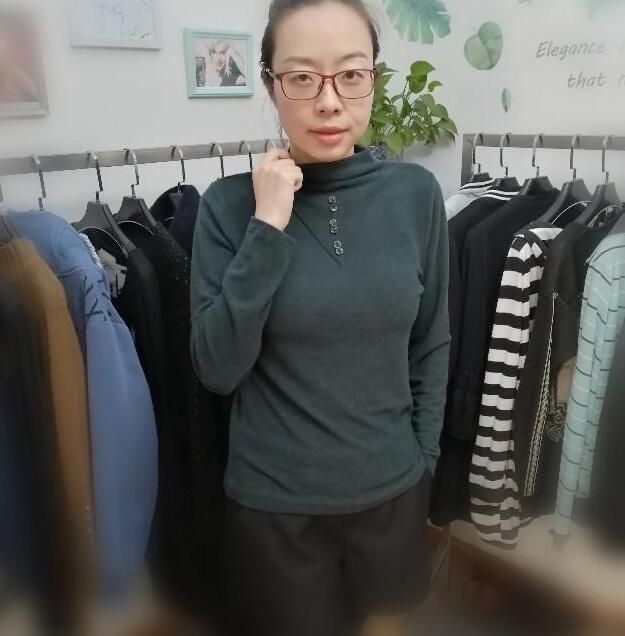 还是加厚高弹棉的T恤,墨绿色的光面设计。在领口加入线条突出V领,一排小扣字点缀。弹性是比较大的,穿衣技巧,中高领搭丝巾围巾都是特别漂亮。喜欢深色优雅的妈妈应该比较喜欢,对皮肤没有什么挑剔。反而会衬的比较白!确实是比较简约大气的款式,其实有的时候服装简单便是美。大家觉得是这样吗?
