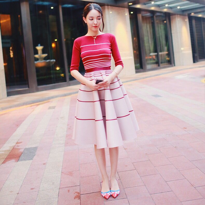 经典的圆领,简单大方,中袖设计,干练简洁无束缚感。条纹印花从上到下又疏到密,又从腰部由密至疏,个性十足,具有美感。上衣是针织面料,裙子是高密度空气层面料,挺括有型,垂坠型佳,非常唯美浪漫。