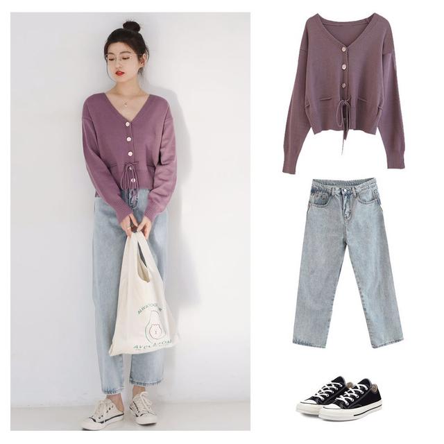 紫色V领针织衫就是一个很好的例子,无论是年纪大的女人穿着显年轻还比较妩媚,年纪小的女生穿着比较温柔,惹人怜爱。穿出来的风格各有不同。搭配也是比较简单的,一件蓝色牛仔裤可以起到很好的衬托作用。