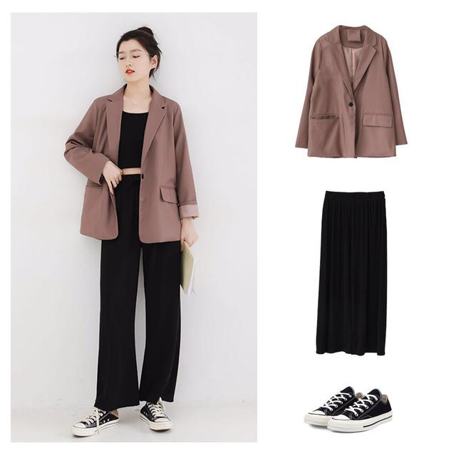 西装与阔腿裤的搭配也是近几年流行起来的穿搭,尤其是在年轻人的心目当中,留下了不可磨灭的印象。不论是走职场女强人路线还是走休闲优雅的路线的女人,都非常偏爱这种穿搭。黑色阔腿裤显瘦百搭还好看,搭配一件豆沙色的小外套,格外的醒目,是人群中很出众。