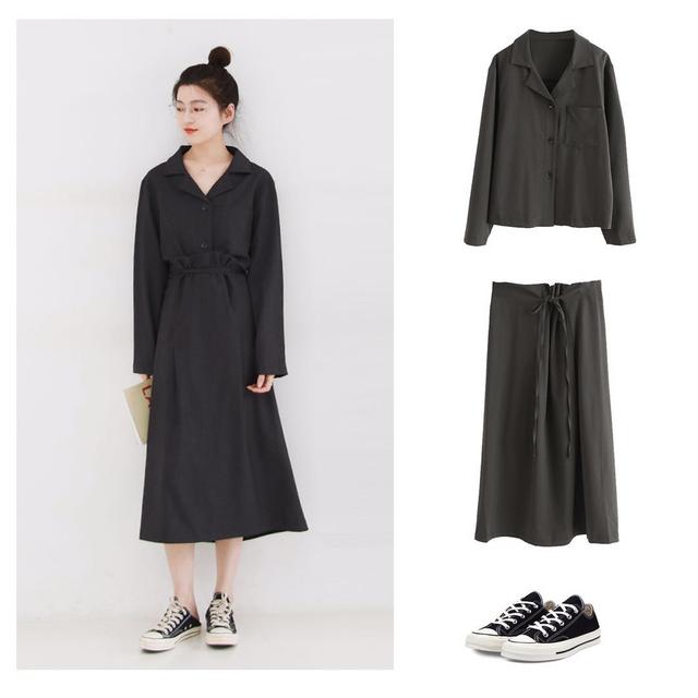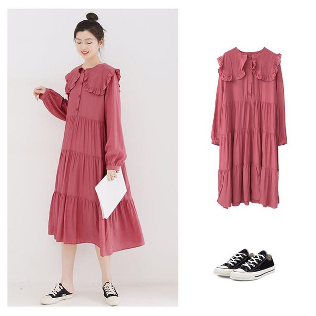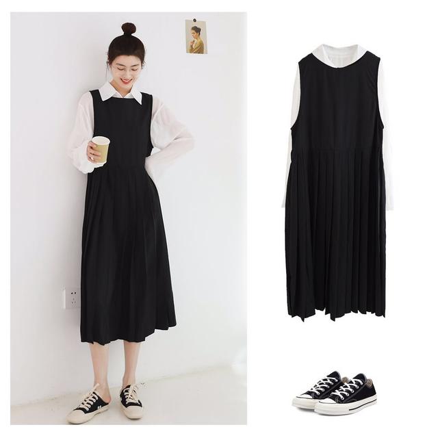连衣裙没有收腰的设计,所以整体呈现出一种过于宽松的感觉,像是穿了一件不合身的裙子,但正是这样的设计让这件裙子愈发可爱。娃娃领设计本身就是可爱女孩儿的专属,裙子部分有一种蛋糕裙的设计,一层接着一层,就如同蛋糕一样梦幻,让人充满希望与快乐。黑色的经典帆布鞋可以作为很好的衬托,进一步烘托穿搭的魅力。纯色衣服怎么搭配图片