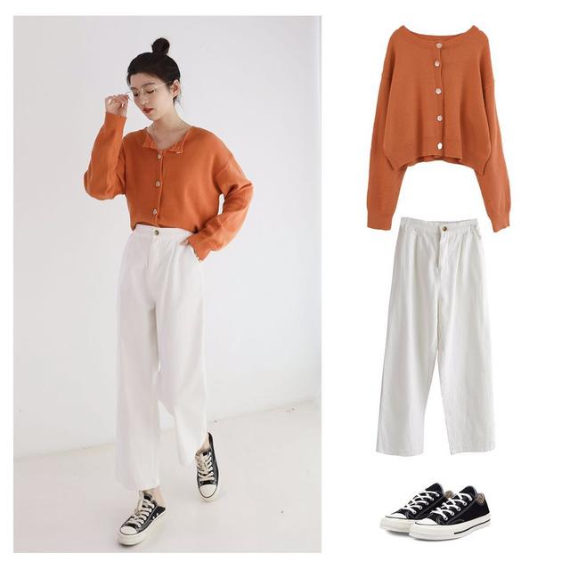 橙色的针织开衫是比较有特点的一件,白色纽扣有一种纯真自然的女人美,我们穿圆领针织衫的时候,也可以解开一颗扣子,营造出翻领的效果。这样的穿法,既可以圆领也可以小V领,变幻莫测。