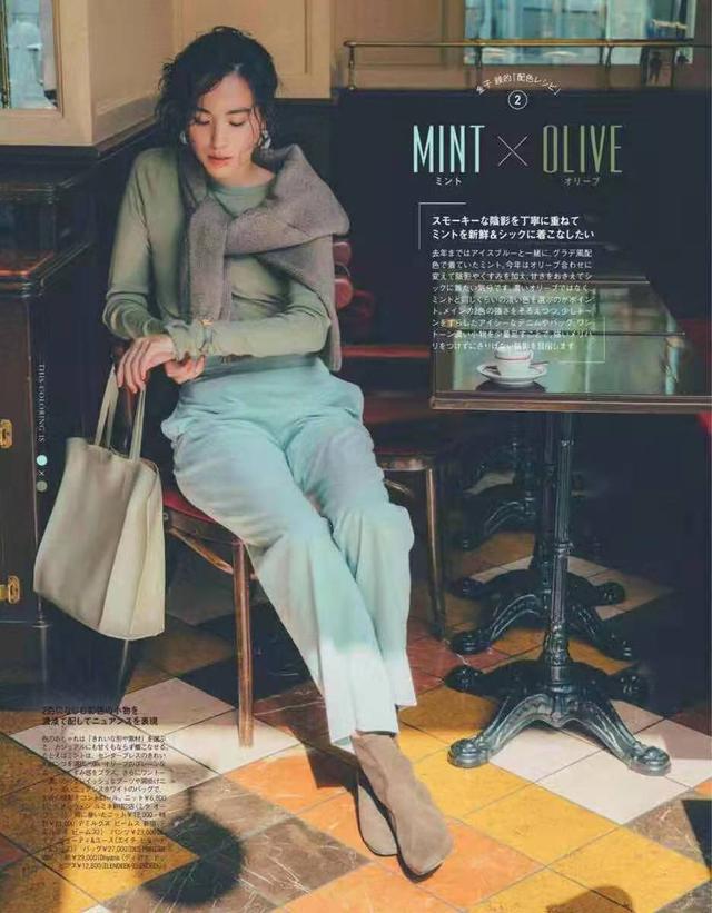 现在很多人在穿搭的时候都喜欢采用叠穿的方式,穿一件比较修身的T恤,在外面利用针织来作为一个披风,这件浅绿色的修身针织就是利用了这种方式,另一件毛衣的颜色也是比较低调的灰色,下半身的裤子选择清新的薄荷绿,整体风格颜色非常统一,而且时尚感很强。