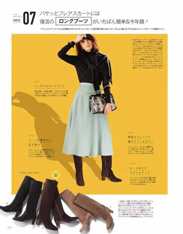 绿色给人一种非常清新亮眼,穿衣技巧,又很俏皮的感觉,宽松的A字伞裙有修身的效果,上半身的搭配时就会选择修身显瘦一些的服装。深一些的色彩会更显瘦一点。造型非常的率性,而且看起来很酷,为了保暖性更好,我们可以在裙子里搭配一双高筒靴子,这种穿搭方式也是今年非常流行的搭配。