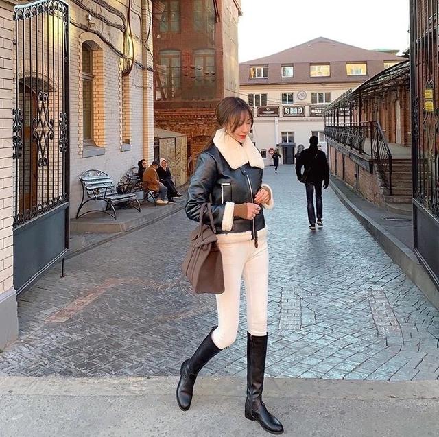 天气冷的时候,你可以穿上摩托车式的外套和带靴子的搭配。就一个字,酷。搭配白铅笔裤,抢眼又时尚,一个棕色包包,瞬间让你成为时尚专家,无论你走到哪里,都是一道美丽的风景,真的超级能彰显你的气质。