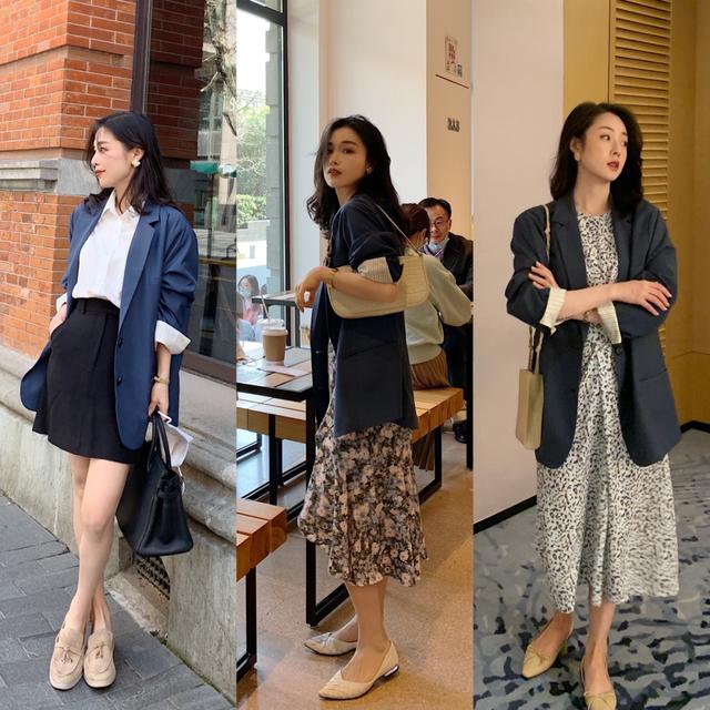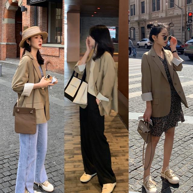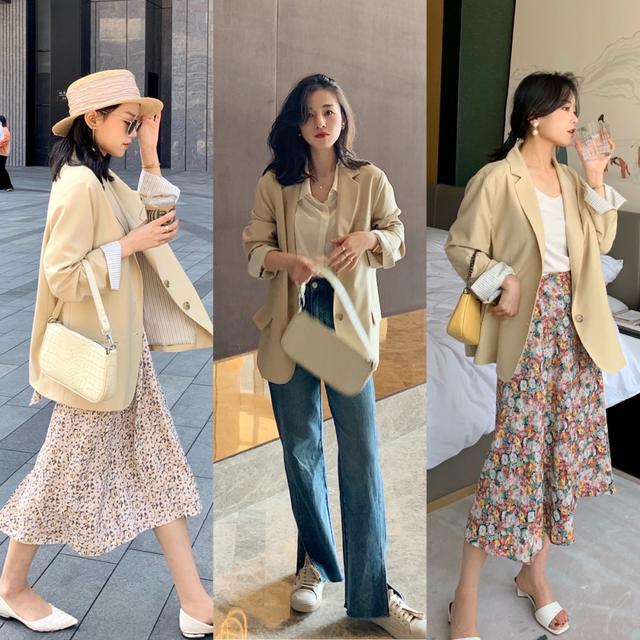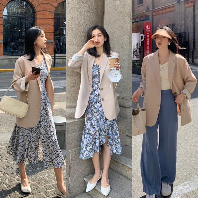 杏色西装外套也是小仙女们春季使用率超高的单品。利用杏色西装外套内搭一条豹纹款的收腰连衣长裙,知性又成熟,分分钟穿出成熟女性的魅力。杏色西装外套内搭V领碎花不规则长裙也超级好看,整体搭配显得温柔又洋气。想要穿出休闲随性范的小仙女们就可以尝试这套搭配了,杏色西装外套内搭淡黄色吊带,下身再搭配一条雾霾蓝色的好玩阔腿裤,视觉上穿出迷人大长腿,整套Look随性又大气。