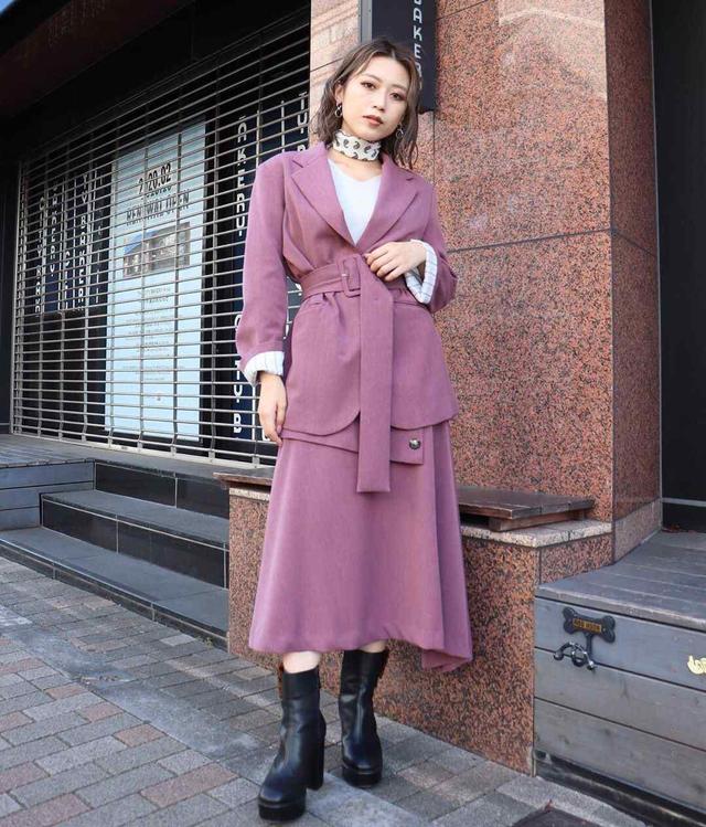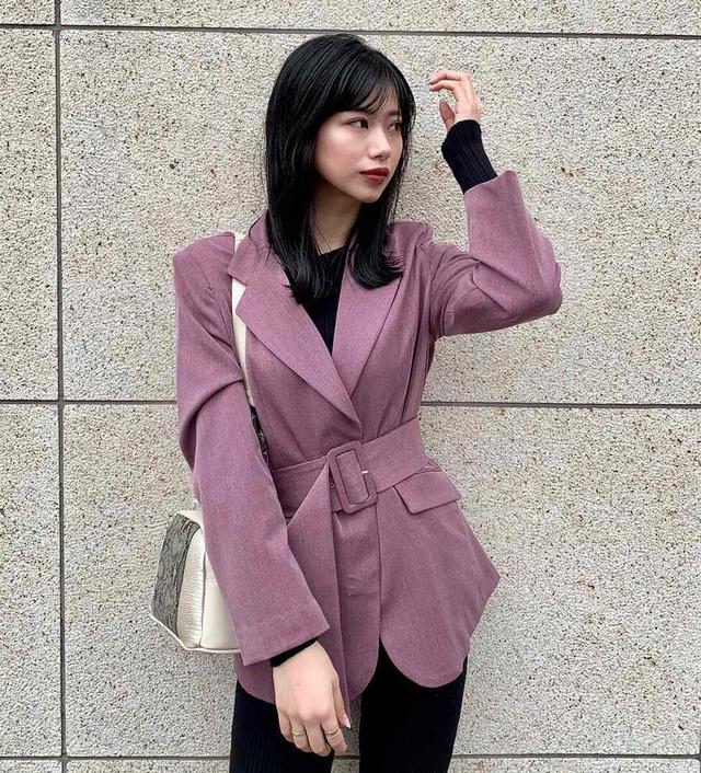 翻领西装外套更严谨,粉紫色西装却尽显女人的魅力与优雅。宽腰带收腰的设计使腰部纤细有型,而且身材的凹凸之处都格外的明显。内搭一件黑色打底毛衣,仍然魅力不减,裤装搭配黑色长款修身裤,笔直又修长的双腿让整个人看起来分外的有气场。