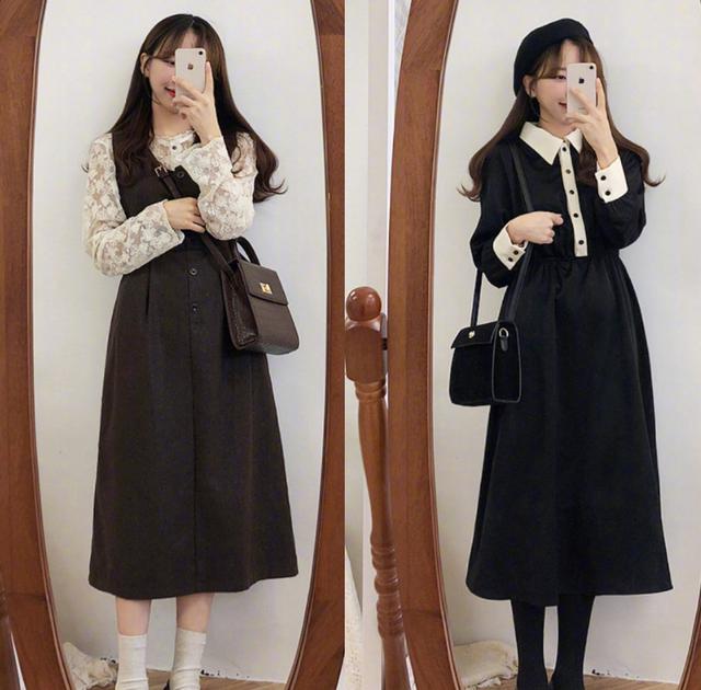 对于很多人来说觉得裙子不会穿出时尚又甜美的风格,其实只要裙子选择对了,不管是什么样的身材,冬季甜美穿搭图片女生都可以穿出甜美又简明的风格。而这两款连衣裙采用的是收腰设计,会让整个腰身看起来更加的纤细,而第1款上身是白色,而下身则是深咖色的这样的连衣裙会受到很多女孩子的喜欢,如果穿上这样一套连衣裙会让人误以为是十七八的小仙女看起来格外的年轻。而第2款学院风会更加的重一些,领口处采用的设计会让人觉得更加的甜美。