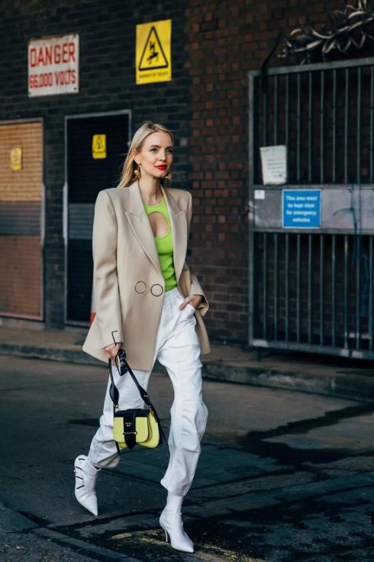 与时俱进是新时代女性必不可少的优秀品质,在穿衣打扮上,我们也要适当加入流行元素,永远走在时尚浪潮前,荧光绿色虽然火热,却十分难搭配,小仙女们不要放弃它,我们可以把荧光绿色小面积的运用到穿搭中,例如选择一件荧光绿色打底衫搭配简约大方的卡其色外套,再手拎一个同色的小包糅合在一起,不仅不会丧失原本的正式端庄感,还会更显青春靓丽,秀外慧中!任何年龄段的妹纸都可以尝试!