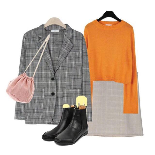 这可以说是非常有个性的一款穿搭了,网格状的西装外套属于休闲的款式,颜色又属于成熟深沉的灰色,穿起来会显得非常优雅大气。橘色的上衣突出的是新颖化,明显的色差搭配,更能突出一个人穿搭的随性。半身裙,不用多说,一年四季中,最显精神和气质的就是半身裙了,半身裙的颜色和西装外套没有很大差别,同色系非常高级,小皮靴也为整个人气质增添了不少魅力。
