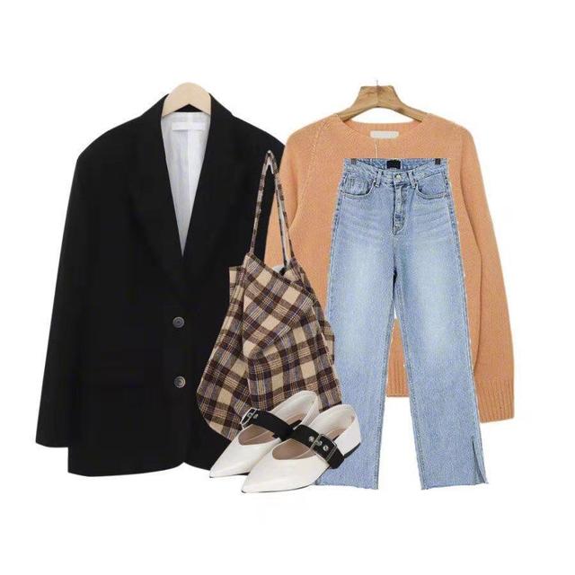 黑色的西装外套简约时尚,黑色属于百搭色,不管搭配什么颜色的衣服都是非常好看的。橙色的毛衣属于常规款,橙色没有那么的鲜艳,而是比较偏暗色的橘肉色,整体看上去并没有那么的张扬,显低调,但是又不缺风格。浅色的直筒牛仔裤简直就是休闲的标志,给人的感觉就像是韩系的一股清流,西装外套也是属于比较宽松的,黑色西装搭配休闲风的内搭也很有特点,活力又稳重。