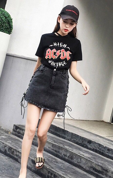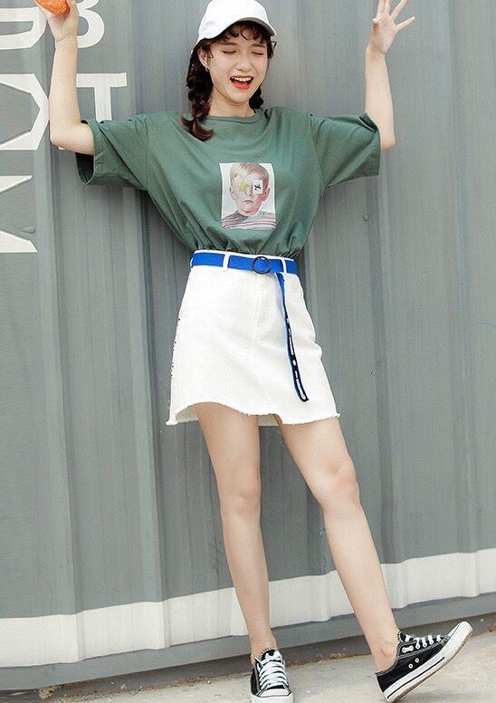纯白色的小短裙,裙摆配上不规则的切割设计,让裙子显得较为独特。配上一条亮眼的皮带装饰和简约的印花T恤,整体清新又帅气。