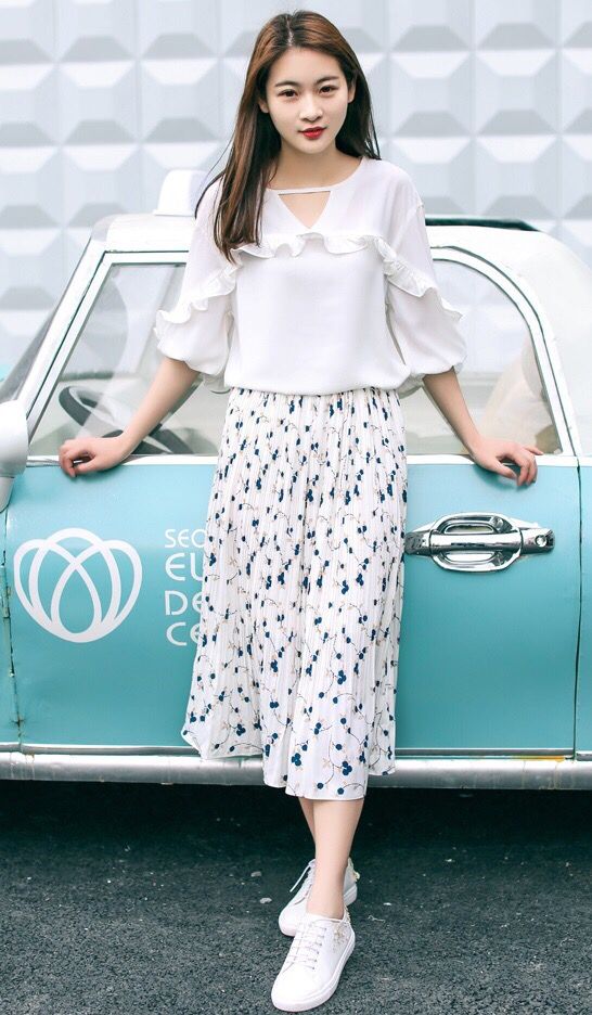 过膝的半身裙可以有效的遮住腿部的肥肉,如果将裙子的腰线提高一些,还有显高的作用。搭配花边上衣,清纯不做作,非常的清新自然。