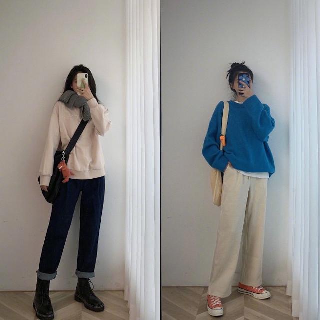 这种糖果色系的甜甜的粉色就很适合秋季了,时尚服装。像萧瑟秋季的一抹阳光一样。粉色这件跟上一件的版型区别不大,只是下装换了一件裤脚更加有少女点缀的直筒裤。搭配一双厚底鞋就顿时能够有腿长一米八的效果了。
