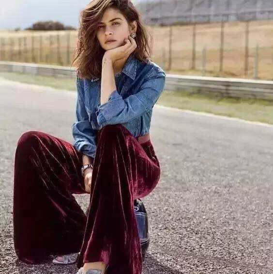 其次就是面料,丝绒阔腿长裤的慵懒感绝对是满满的,因为丝绒面料十分的柔软顺垂,给人一种很随意的睡衣风感觉,而且丝绒最近特别火,穿上它一定能让你吸睛度大增。