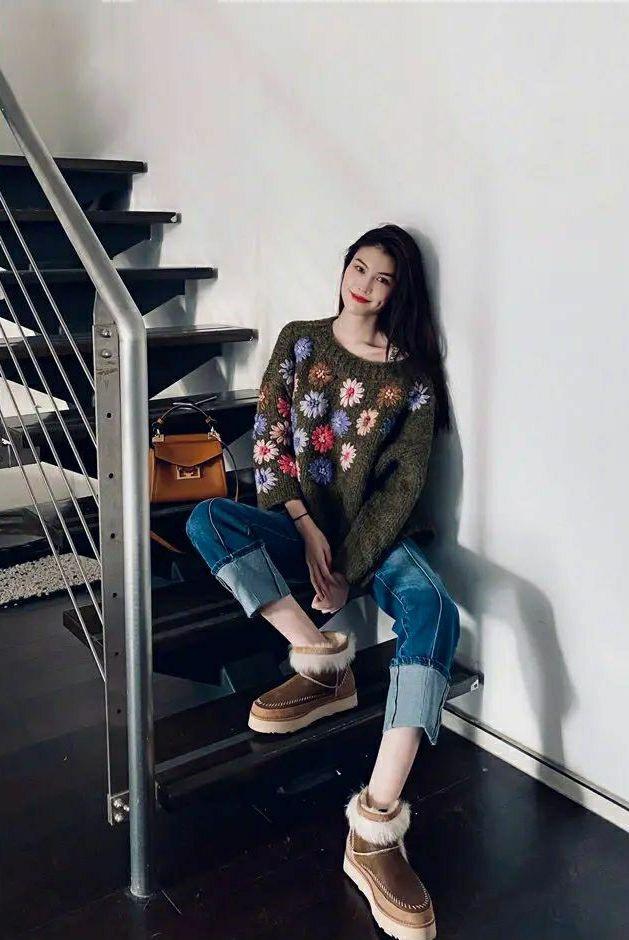 上身一件深绿色的毛衣,毛衣上的花朵装饰给整体一种色彩感,非常时尚的装饰,给整个沉闷的冬季增添了几分时尚感。下身一条深蓝色直筒裤,更是给整体增添了许多青春元素,这样的元素同时也是适合各个年龄段的,所以女生们在冬季选择毛衣和牛仔裤是最不容易踩雷的。