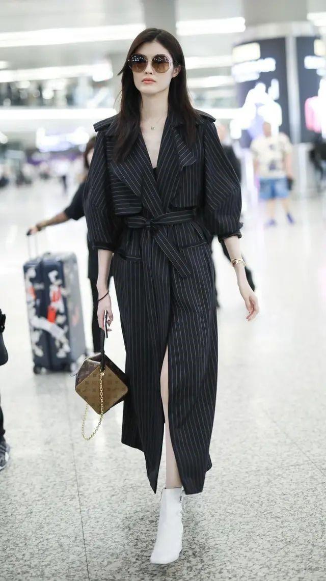 接下来要看的这一身也是非常帅气的,同时也是很霸气的,长款衣服给人的感觉就是拉长整体身高,所以整体看起来非常好看,很适合何穗。这一身衣服是黑色系,竖纹有拉长身高的作用,所以这一身衣服给人的感觉就是帅气中透露着干净利落。