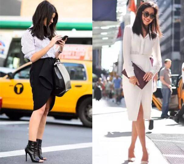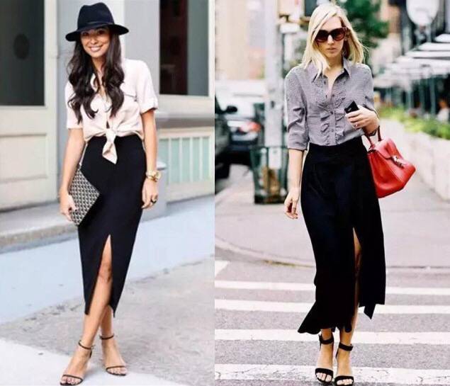 半身开叉裙和浅蓝色的商务衬衫搭配,开叉的裙口打破商务衬衫的呆板,显得干练优雅。这样开叉较低的款式适合上班穿,既不会显得过于暴露,又有点新颖。