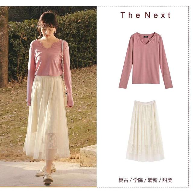 白色本身就能给人一种仙气满满的感觉,再搭配上长款蕾丝元素的半身裙,简直就是仙女下凡。裙装用了比较软的纱质,又用了女性化十足的白色蕾丝,是温柔的女人最喜欢的风格。所以在搭配的时候也用温柔风的其他单品搭配准没错!粉色上衣柔软的布料,V领突出颈部线条,最后搭配一款杏色小皮鞋,走起路来,裙摆飘扬,看上去造型十分温婉又淑女。