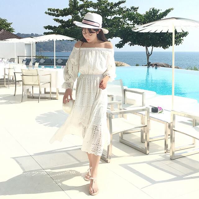 很大气的一条长裙,结合了今年很流行的一字领设计,展现了女人性感的肩线和锁骨~洋气好看的白色更加完美了,干净文艺又很清新。精致的款式配上舒服的面料,这个夏天就美美地过吧~