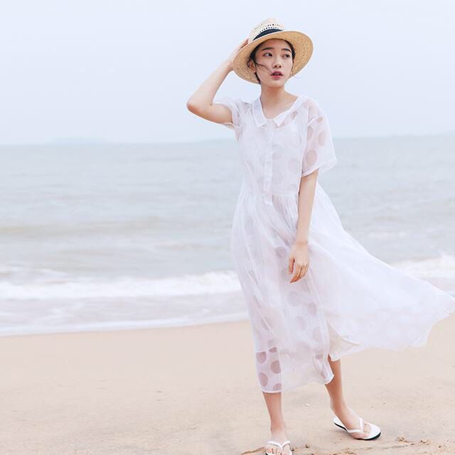 这款复古欧美的套装,采用了非常轻薄的欧根纱连衣裙,轻复古的娃娃小领,有点小宽松的设计,别致可爱,配合裙子的长度,真的是太仙了!透视波点又性感俏皮加分了,妹纸们果断下手吧!