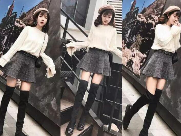A字裙是一款超显瘦的裙子,这款还带有百褶裙的气息,穿上就很能遮肉显瘦的,超短的裙摆设计,实在是轻松就可以获得大长腿,格子的元素又那么的受欢迎,搭配过膝靴,靴子是拼色的设计,整体搭配显高又显瘦。