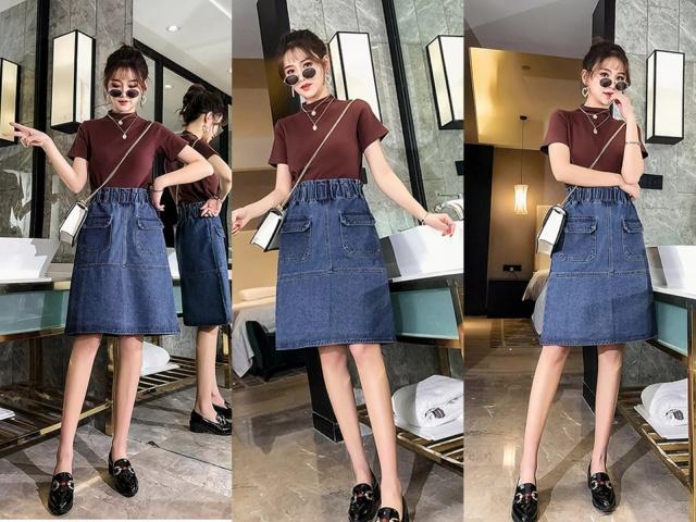 这款简约的A字牛仔半身裙,有着休闲的特性,同时还带着修身显瘦的功效。松紧腰的设计让你能很好的穿脱,一字前面的翻盖口袋装饰,美观实用,刚过膝盖的长度,很好的遮盖住了小肚腩和小粗腿,上身真的很显瘦,搭配半高领的短袖T恤,带着浓郁的清新文艺气息,脚上再穿一双平底乐福鞋之后优雅迷人又尽显文艺女青年范,时髦的人都这样穿了哦。