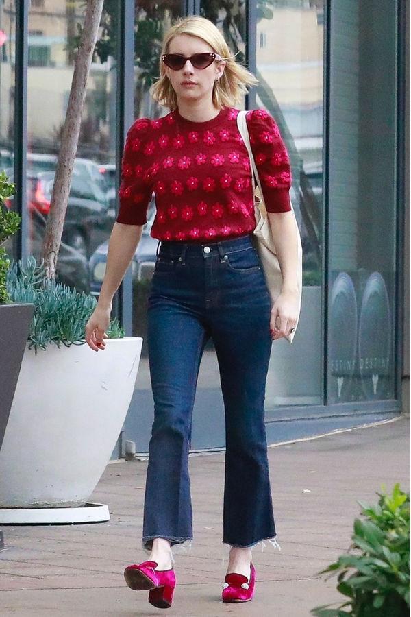 喇叭牛仔裤有着它独特的裤腿设计:越往下越夸张,比铅笔裤的裤型要求要低得多。帮助很多大腿细小腿粗或O型腿的女孩子完美的掩饰了缺点。它自带有一种复古气质,穿上身以后不仅显得文艺十足,还特别的时髦经典,极显腿长。用红色半袖针织衫搭配喇叭牛仔裤在知性中透出一丝女人的魅力,简约大方。脚上穿着与上衣同色系的粗跟鞋,上下相呼应。不适合梨形身材的女生,容易凸显胯宽的缺点。