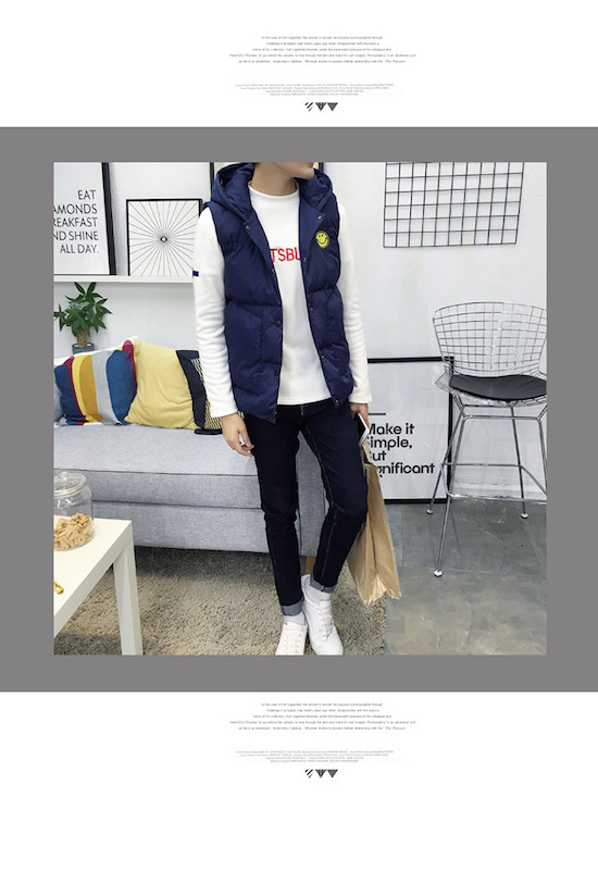 2.棉马甲遮盖了形体上的一些不足,它可以使下半身看起来更长,适合哪些身高略矮的男士。蓝色亮面材质为冬天增添温暖感。牛仔裤搭配酱色球鞋与上身的搭配更加协调。