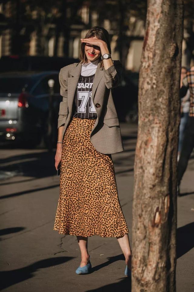 西装和豹纹半裙也是潮人们很喜欢的造型之一,通勤知性的西装外套配上野性不羁的豹纹半裙,让你的通勤造型瞬间编的高级很多。用今年非常流行的廓形西装搭配豹纹裙,会将豹纹裙演绎的更加休闲不羁。西装和豹纹裙的造型中,可以选择超短款的豹裙,也可以选择长款的豹纹裙,超短款的豹纹裙能秀出纤细大长腿的感觉。长款豹纹裙则能显得更加文艺风,选择A字款的豹纹裙最为合适,文艺不显个矮。