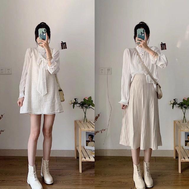 长款的半身裙搭配的是针织裙,米色的针织裙往往更提升了女人的温柔气息,衬衫塞进百褶裙里面也提升气质感。