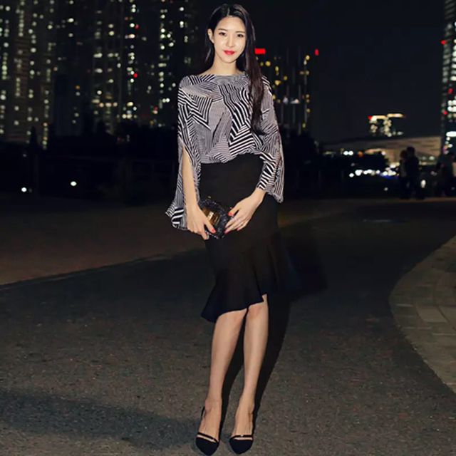 端庄典雅的中裙,充满了OL职业的风采。包臀下的妖娆身段展现,露出迷人的小腿,十分夺人眼球。女装搭配!不规则荷叶边的尾摆设计,少女的气息犹在。