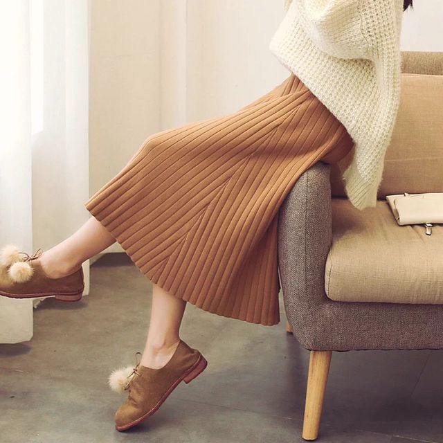 包臀设计的半身裙,看得见的竖条纹针织纹路,极好的描绘了纤细的腿部线条。用高贵又复古的驼色系,呈现今年的流行风姿,风吹中又飘逸,也有典雅气质。