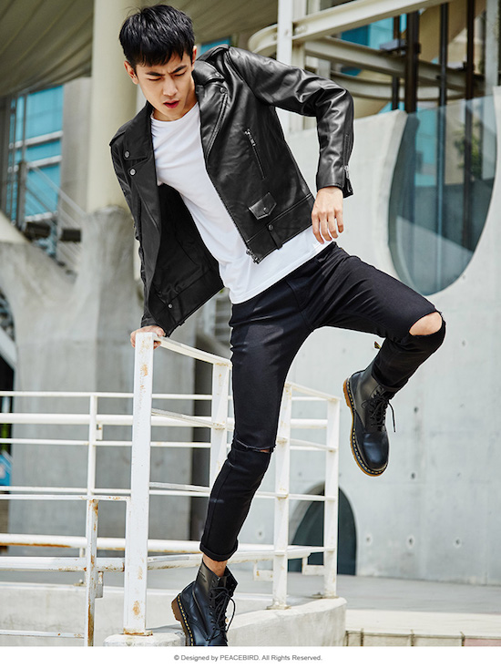 3.经典的黑色皮夹克舒适又百搭,里面随便搭个白色t恤,下装搭配蓝色破洞牛仔裤,更加能够配合机车夹克的年轻帅气感,并且能将下半身的比例拉长,搭配一双时尚马丁靴独具韵味。