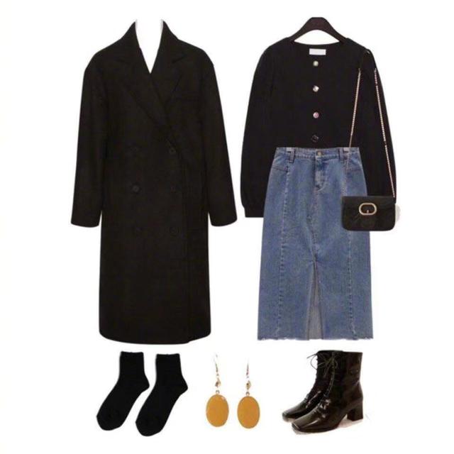 黑色长款大翻领外套,气质气场都是非常的足,黑色与黑色的搭配也是比较低调沉稳的搭配。黑色的毛衣,表面一排简单的银色扣子设计,给黑色增添了几分的亮度,让黑色不会显得那么的沉重,搭配一条牛仔开叉半身裙,牛仔的搭配十分的休闲,开叉的设计也十分的时尚,并且也是很显高显瘦的一款,一双短跟皮质平头短靴,绑带的设计多了几分的酷炫,用活力复古的土黄色耳饰作为点缀,给整体增添一点色彩,多了几分的明亮感,时尚感十足。