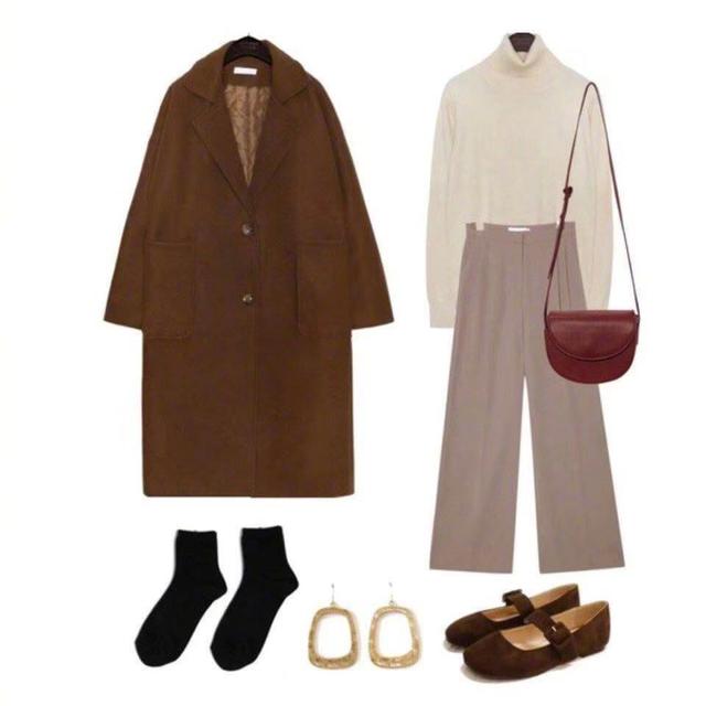 焦糖色的大衣低调又显气质,但是有的女人会觉得颜色比较沉闷,会比较显老气。选择米白色的高领毛衣,浅色的搭配会降低外套厚重颜色的暗度,高领的设计会比较显白,不会显得特别的沉闷。藕色的宽松阔腿裤简单又柔美。搭配一双丝绒单鞋,平底的搭配十分的柔和。红色的包包,一个小单品对整体的颜色起到了一个点睛的作用,也是比较温暖复古的穿搭。