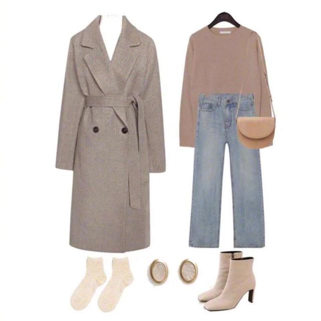 焦糖色的大衣低调百搭,上身会特别的优雅气质。卡其色的紧身半高领毛衣,简单又十分的温柔优雅,又能够很好的显现出女生完美的上半身,搭配开叉牛仔半身裙,前开叉的设计有几分的性感,高腰设计可以很好的拉高整体的腰线,非常显高,再搭配一双同色系的短靴,温柔又有气质,选用复古风的珍珠大而定,金色边的设计多了几分的奢华,打造出优雅时尚的轻熟风。