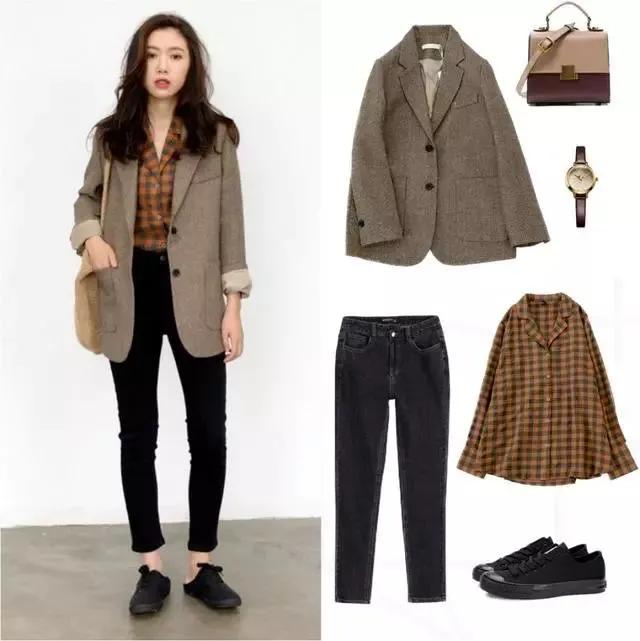1、这款复古咖色西装外套,简约又不失设计感,直筒的oversize版型略微宽松,上身藏肉显瘦,人字纹的元素,满满的英伦风,撞色卷边的袖口设计,显得干练而随性!搭配复古格子衬衫+黑色小脚裤+小黑鞋,把衬衫塞进裤子里,有一种90年港片女主角的味道,帅呆了~