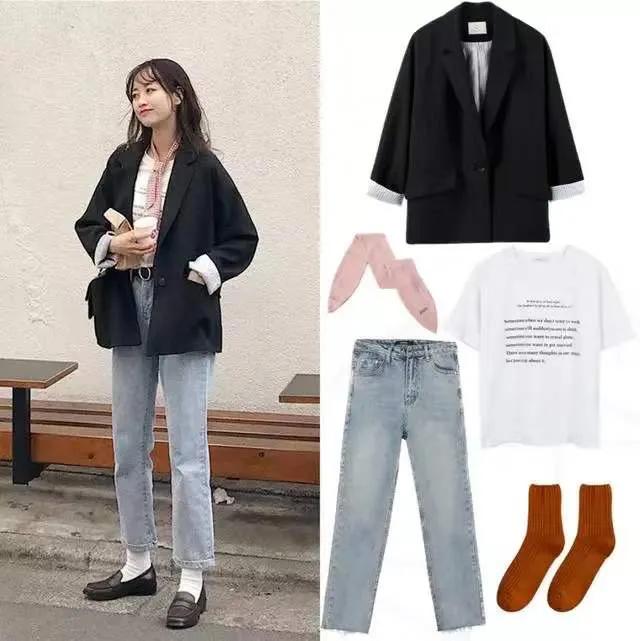 4、一款非常适合凹造型的的黑色西装外套,整体的垂坠感,很大气高大上,细黑白条纹的元素,多了几分随性休闲范,干净耐看,塑造版型的整体美感。内搭简约的字母t恤+浅色牛仔裤,脚踩英伦平跟鞋,多了一份帅气大方,学院风少女感十足。