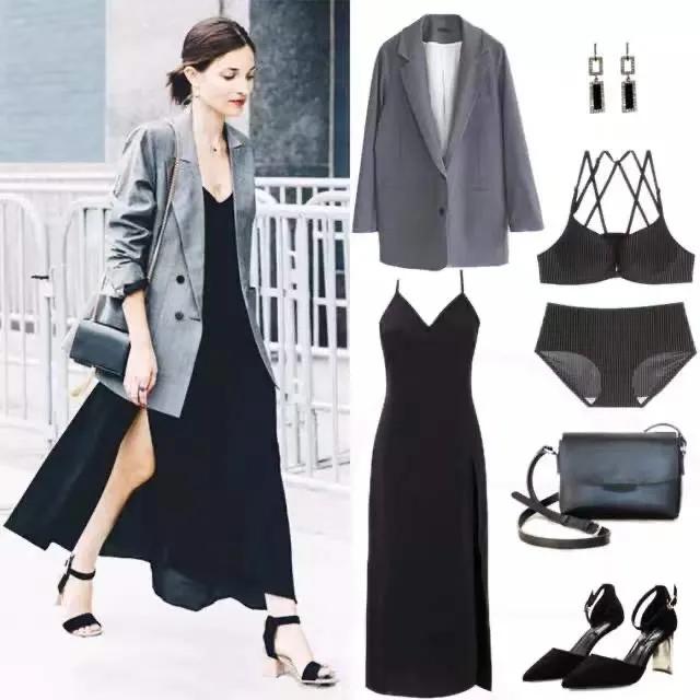 5、灰色的西装外套,版型随身型,但不呆板,有一种OL知性气质,通勤风的设计,在端庄中加入一丝洒脱。搭配纯黑色V领的吊带长裙,优雅干练,自带一丝小性感,增添了几分女人味,既有严肃的氛围又不太过死板,气场和气质马上开挂!
