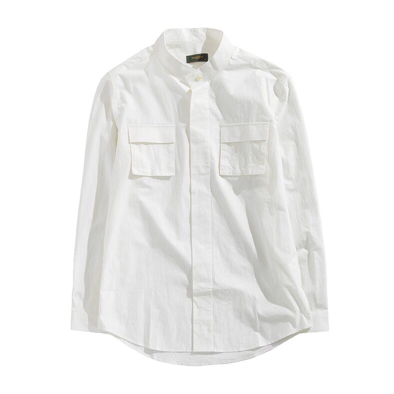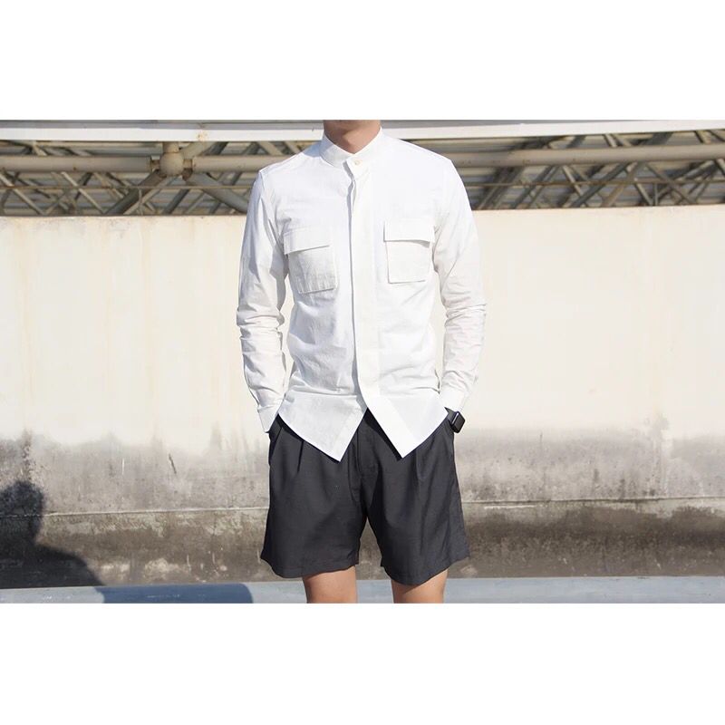 前面个性的两个翻盖口袋,显得十分有美感,而且简洁的立领,也将颈部的线条勾勒得十分显瘦。下装随便牛仔裤或者休闲裤都可以驾驭,这样的白色衬衫一上身就具有十足的男闺蜜感觉。