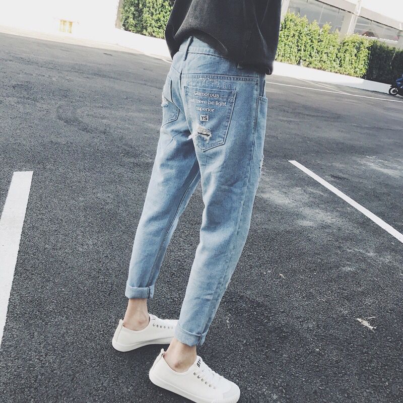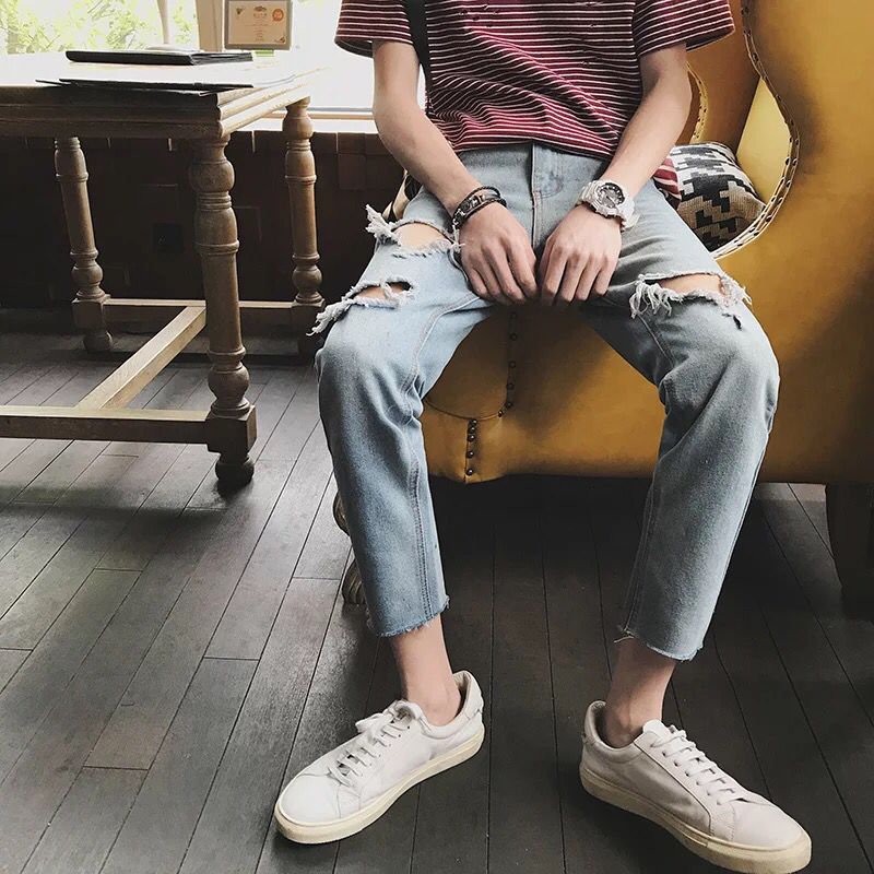 男士韩版街头风大破洞牛仔裤,九分裤的裤装,非常好看, 浅浅的蓝色,真的很好看在夏日的阳光下,会显的格外的帅气破洞,磨破,做旧设计更加显得潮味很酷!看到它,有没有迫不及待穿上它去大街上走一走的赶脚!