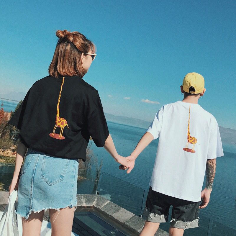 圆领短袖潮男女士宽松衣服上衣,很单薄的一款上衣,后背上的一个长长的长颈鹿设计,很形象,是不是看起来很逼真很好看啊,这款可是情侣款喔,好不好看你一眼就看穿。