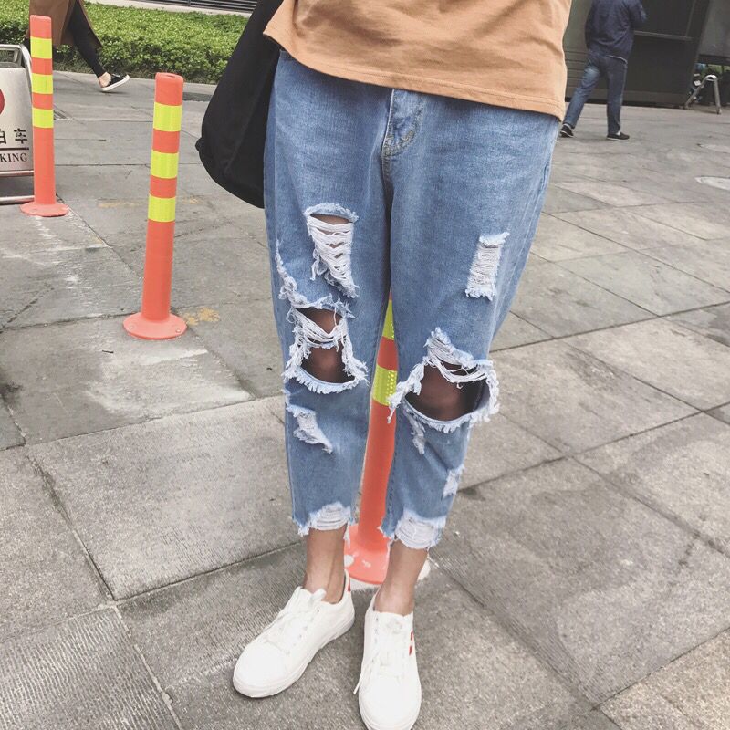 韩版修身小脚青少年破洞牛仔九分裤, 这条洗水破洞牛仔裤的裤型非常好,纤细而修长,但不会紧绷。这样的裤型能很好的包容和修饰我们的腿部线条。