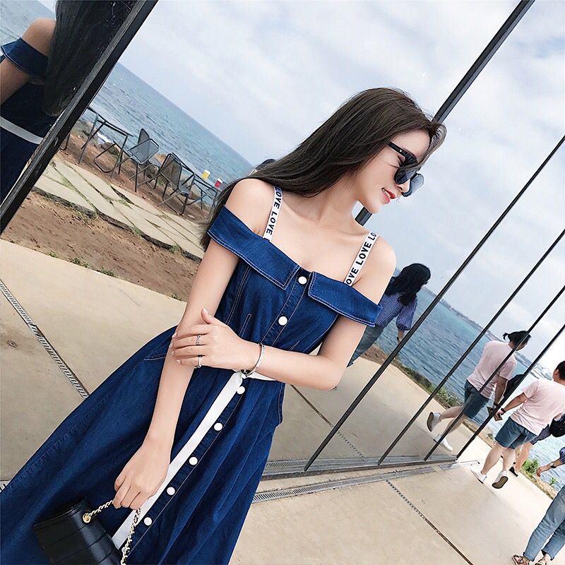 无牛仔,不夏天。牛仔面料也要来“搞事情”。肩带选用的是“love”字样的字母织带,和酷酷的牛仔面料一搭,显得很有女人味呢。做成一字领,露出大半香肩,诱惑而迷人。胸前做了白色排扣,与这抹深蓝形成对比,很抢眼哦~