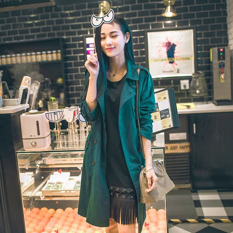 简约利落的版型,属于多年都不会被淘汰的款式,能起到很好的遮肉作用,中长款长度,视觉拉伸,显瘦有道。经典双排扣设计,利用配色树脂扣与鹿皮绒布相辉映,淡淡的散迷人气息。